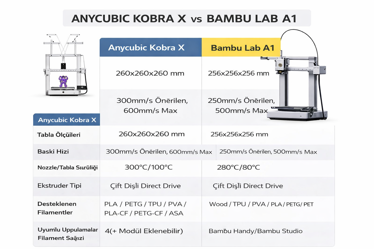 *Geniş Malzeme Uyumluluğu: 300°C’ye kadar ısınabilen dayanıklı nozzle ve 100°C ısıtmalı tabla sayesinde Kobra X, PLA, PETG, TPU, PVA gibi yaygın filamentlerin yanı sıra karbon fiber takviyeli PLA/PETG ve ASA gibi mühendislik malzemelerini de sorunsuzca basabilir. Bu sayede projelerinizde malzeme seçimi konusunda özgür olup, hem esnek hem sert filamentlerle yüksek başarı elde edebilirsiniz.